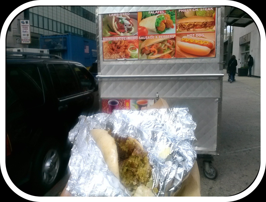 lunch from falafel cart on corner in the city of Brooklyn, NYC