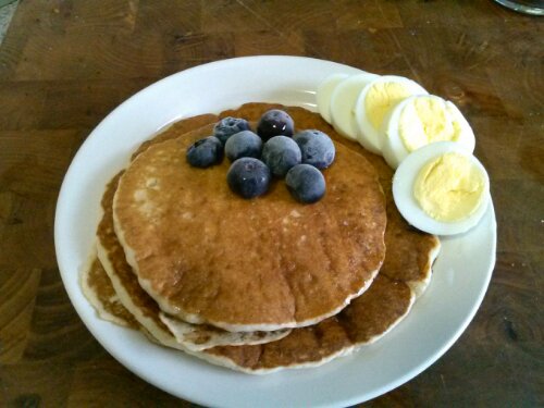 Pancakes, blueberries and eggs with Guinness and Milk.
